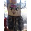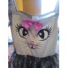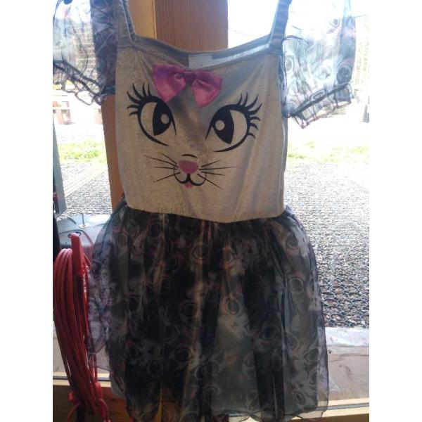 Great dress with capped sleeves. Cat face (sparkly pink nose and tongue) on front of bodice with pink bow. Cat pattern on front of skirt with grey underskirt. Age 5-7
